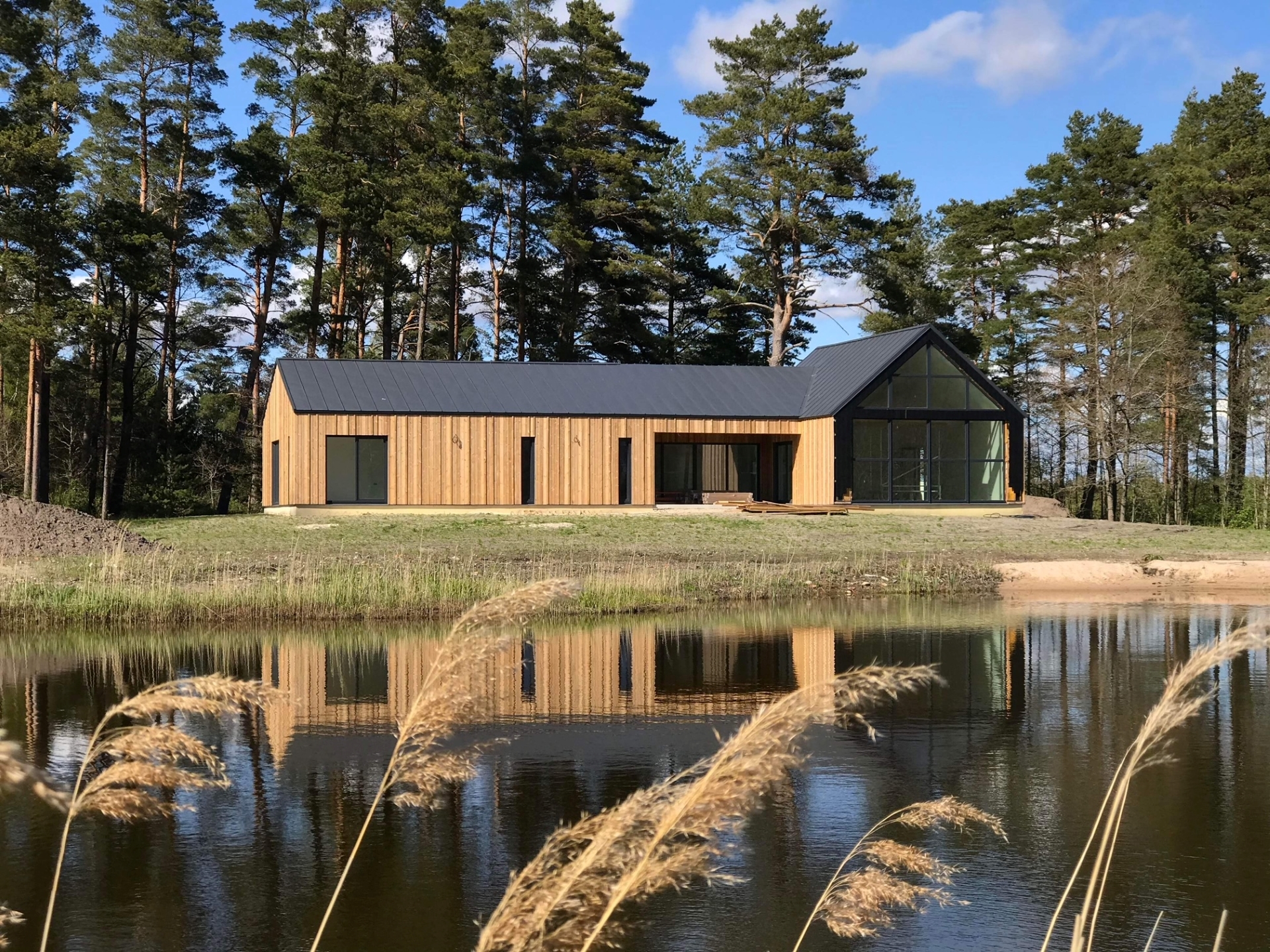 This stark one-storied house within its big open garden is located on the southern edge of a pine tree forest. The secret the visitor gets revealed when entering the main entrance, is a view into the garden and onto a private lake. The light-flooded entrance area connects the three parts of this home: the spacious living and dining room, the quiet private part and the surrounding nature.